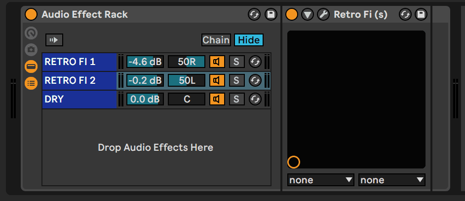 Ableton’s Audio Effect Rack allows you to stack different effects chains. We’re going to set up three chains for the stabs: one dry chain and two ‘wet’ chains with Retro Fi.